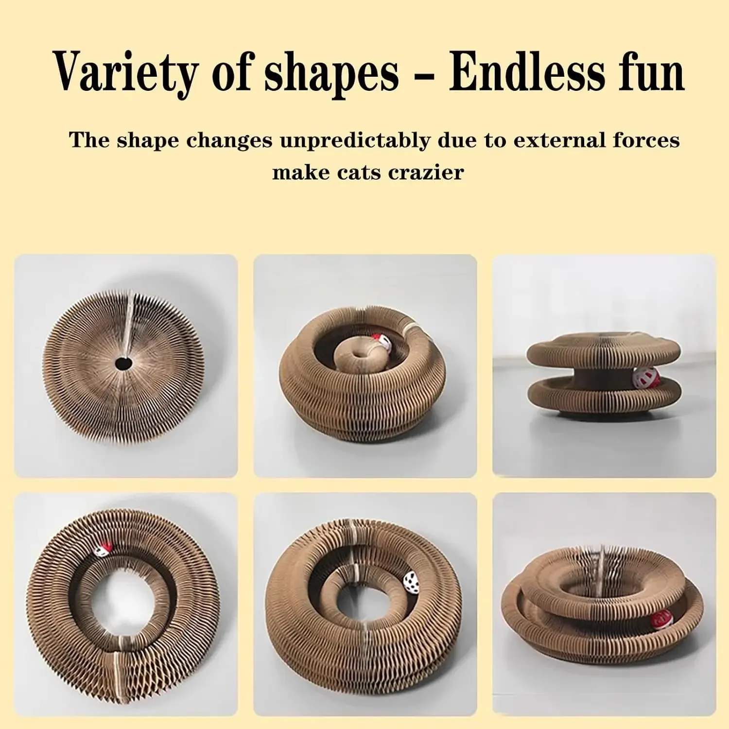 Kitty Kurlz Cat Toy is a accordion-style foldable cat scratch board toy with bell, offers transformative joy, durable construction, and is an interactive toy that fulfills cats' natural scratching urge.